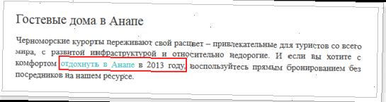 Мы еще раз пересмотрели все тексты, подкорректировали вхождения слова “Анапа”. Но ключевым моментом стала чистка контента от фраз, заточенных под сезонный спрос. Тексты большинства страниц содержали ключевые фразы с упоминанием 2013 года: отдых в [курорт] в 2013 году, жилье в [курорт] в 2013 году и т.д. Их мы везде убрали: