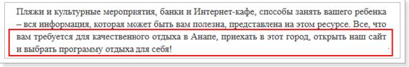 ….На Вашем сайте были проиндексированы страницы, содержащие списки поисковых запросов, то есть фрагменты текста, предназначенные не для пользователей, а исключительно для продвижения сайта в поисковых системах….. Обратите внимание на подобные страницы http://www.anapa-new.ru/anapa-chastniy-sektor/blog